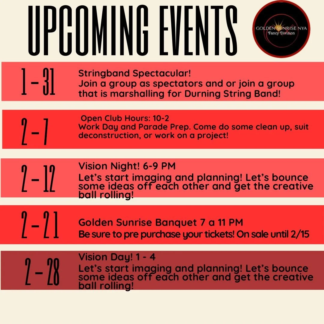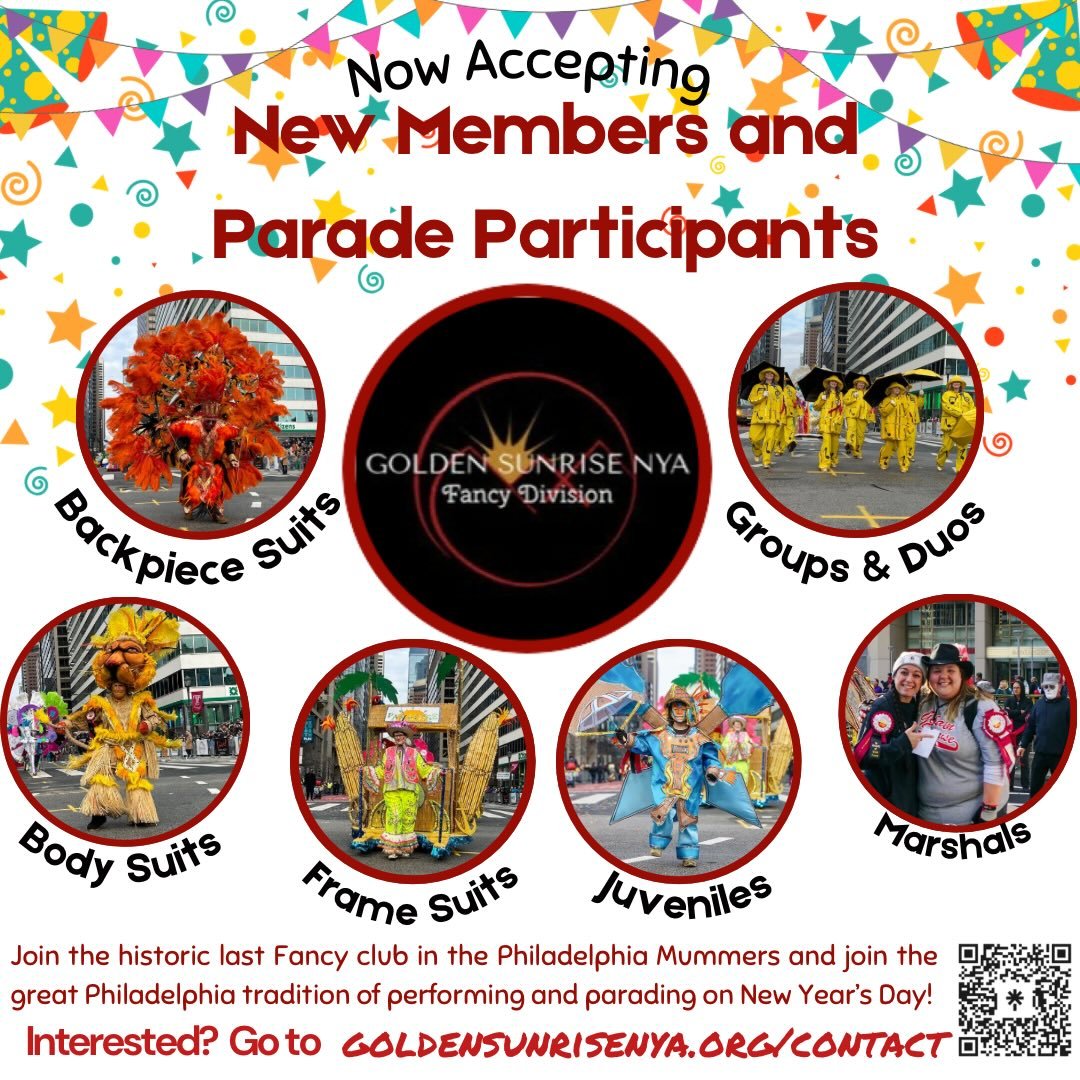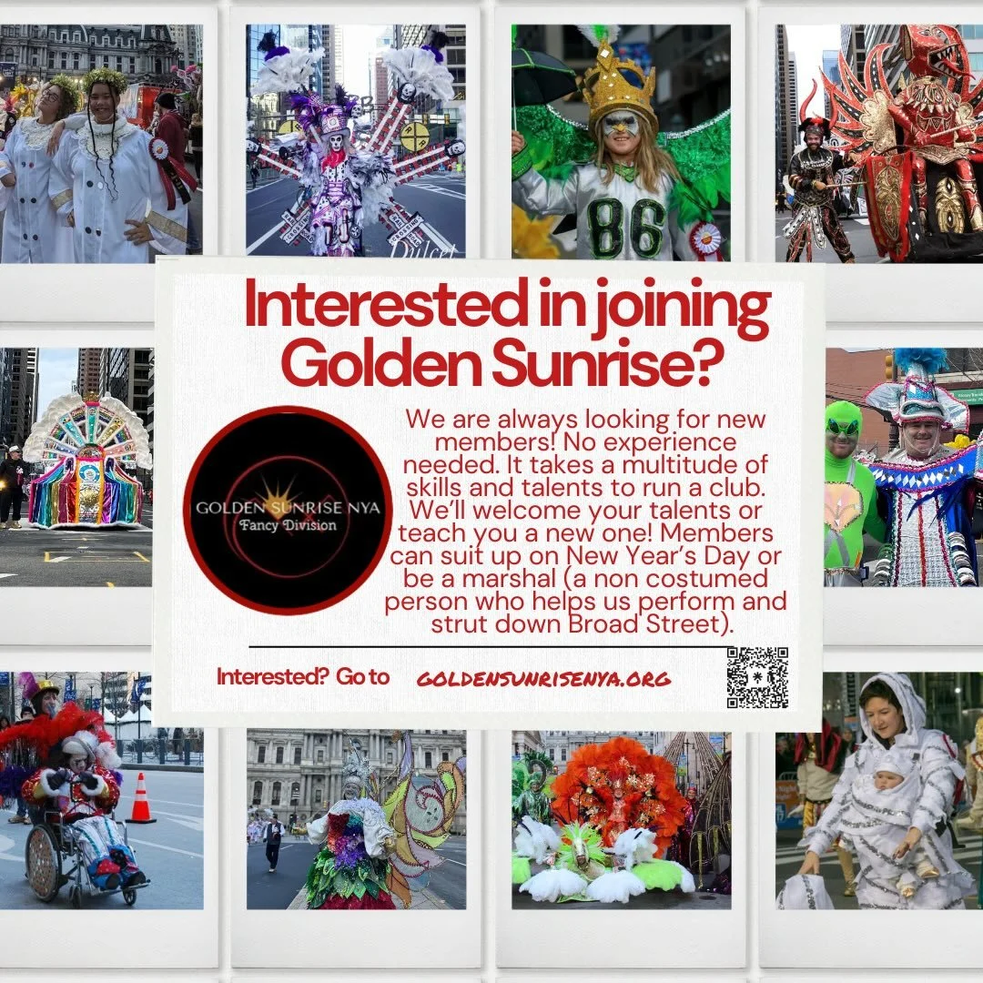 We are the Little Club That Could! We are the last remaining Fancy Club in the Philadelphia Mummers keeping the Fancy Division folk art alive. We are known for our big elaborate beautiful suits and the artform they represent. The Golden Sunrise mummers club values family, friends, inclusivity, diversity, individuality, teamwork, glitter, sequins, showmanship, joy and, of course, New Year’s Day!